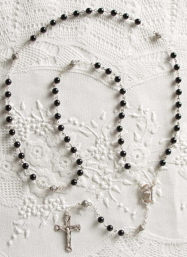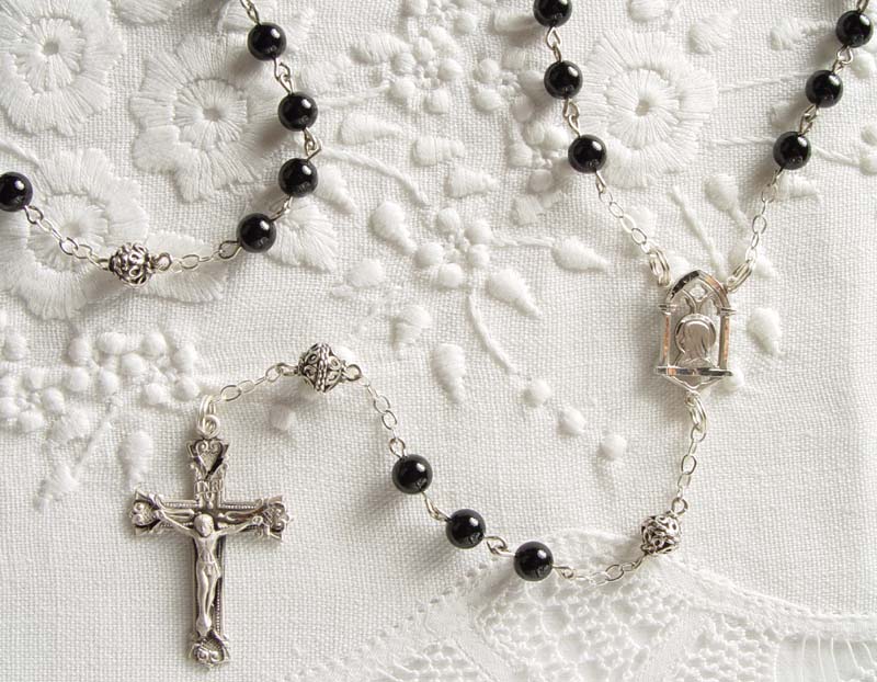 Black Onyx w. Sterling Bali beads - 6mm 5 decade rosary. Handcrafted w Sterling Silver. [ Bag: velvet bag ]
